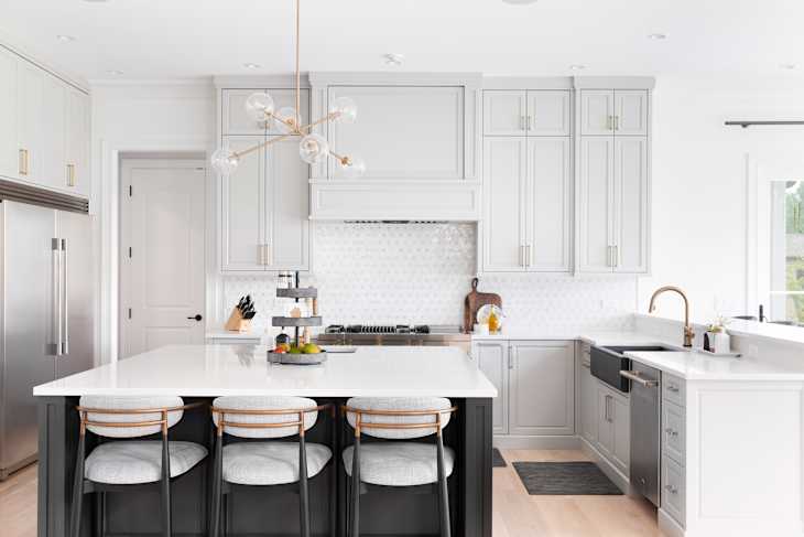 That doesn’t mean you need to completely repaint your white cabinets! Instead, try swapping out the hardware, which is a super easy DIY. If you want to try something that feels a little fresher, both designers are fans of metal tones, like a brushed-steel sink or a brass drawer pull. And if your heart is set on your angular black handles, Jordan recommends mixing up your metals throughout your kitchen to soften the overall look.