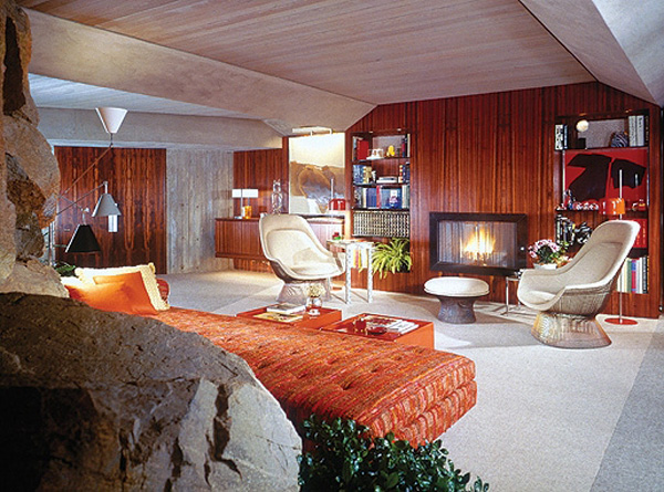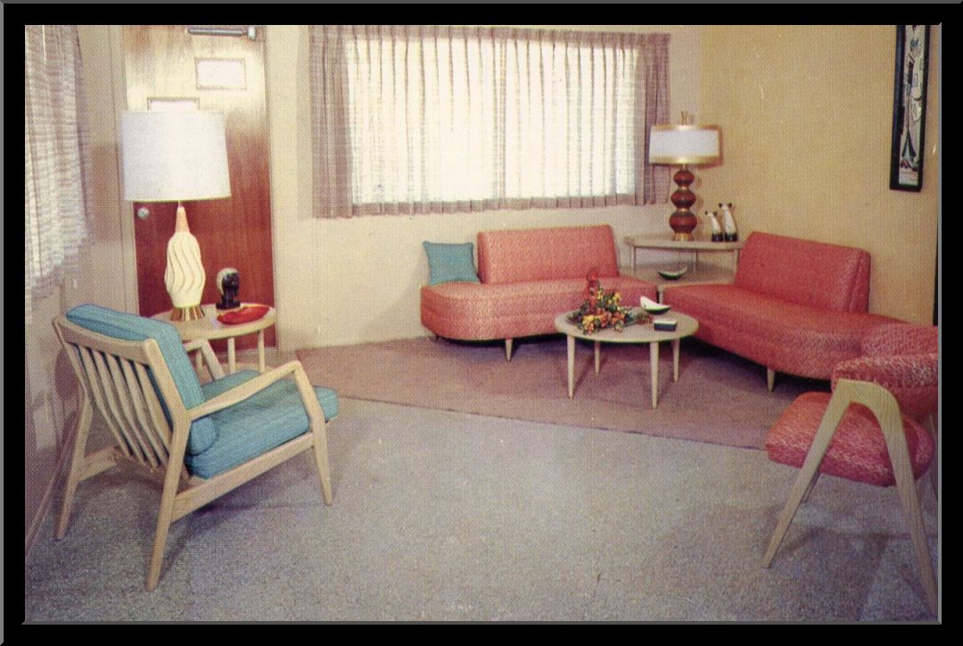 Long and low profile sofas were the only way to go, and preserving them in vinyl meant maximum longevity. Pastels were the reigning color palette (as seen in Best Design Idea‘s cotton-candy living room), often in poppy, contrasting hues like pinks and greens (a la Tropics of Meta’s sitting area, shown third). Carpet was a luxury, and if the dough was burning a hole through your Victorian-era wood floors, this is where you splurged. Advances in molecular technology also inspired atomic shapes and space-age decor.