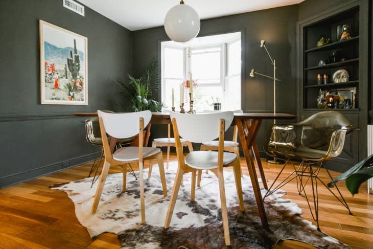 Say you inherit a small round dining table and only two dining chairs, for example. Thomas says to just go with it. “Buy another set of chairs that don’t try to match,” she says. Or get all different kinds of chairs in one color. Then maybe add in one accent chair in a funky color. There aren’t rules, just one stylistic suggestion. “With no designated host end of the table, look to keep the chairs of a similar surface—hard surface chairs with hard surfaces instead of fabric,” says Thomas.