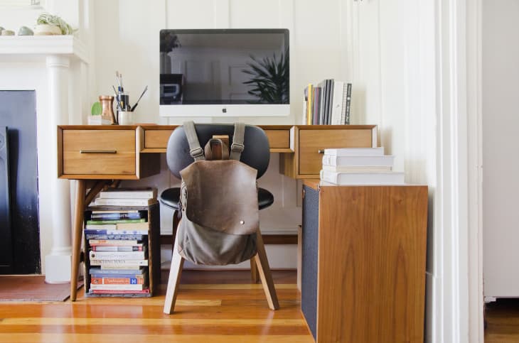 If you’re anything like the renter of this Brooklyn apartment, you need a lot of storage space. A bench strategically placed underneath your desk serves as a makeshift shelf for all the supplies you need.