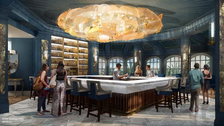 The concept art for the bar gives a sense of how whimsical yet modern the lounge will be. The centerpiece is the striking grand golden chandelier, which is a nod to both Belle’s golden ball gown and Beast’s magical rose.