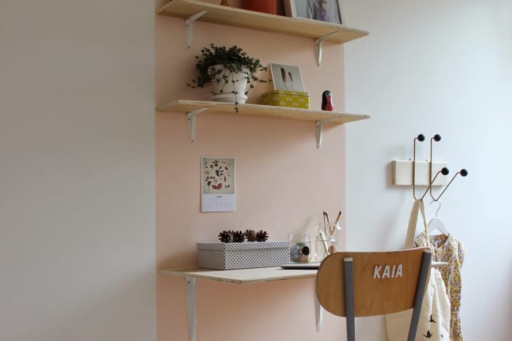 Create a primping station in your bedroom without investing in a vanity. Paint a colorful square on the wall and add a shallow shelf painted to match, as spotted on Decocrush, above.
