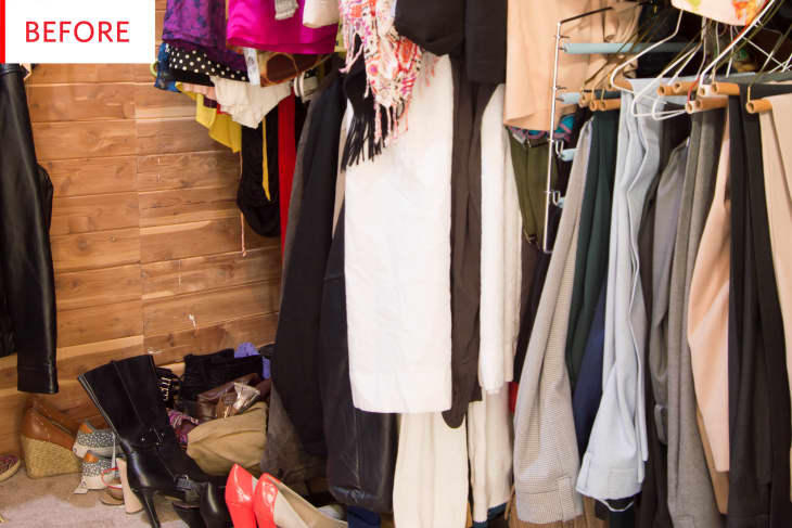 You can see all the hallmarks of an overtaxed closet: jumbled hangers, overcrowded rods, crammed-together garments, a lack of organization, and the dreaded Shoe Heap.