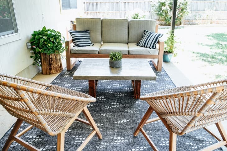 If you’re fortunate enough to have an outdoor space to decorate, you may wish to add a coffee table there, too. Blogger Amanda Hendrix built a concrete-look table modeled after one she saw in stores. For a lighter-weight piece, she skipped concrete molds and instead created the top of the table from plywood finished with skim coating.