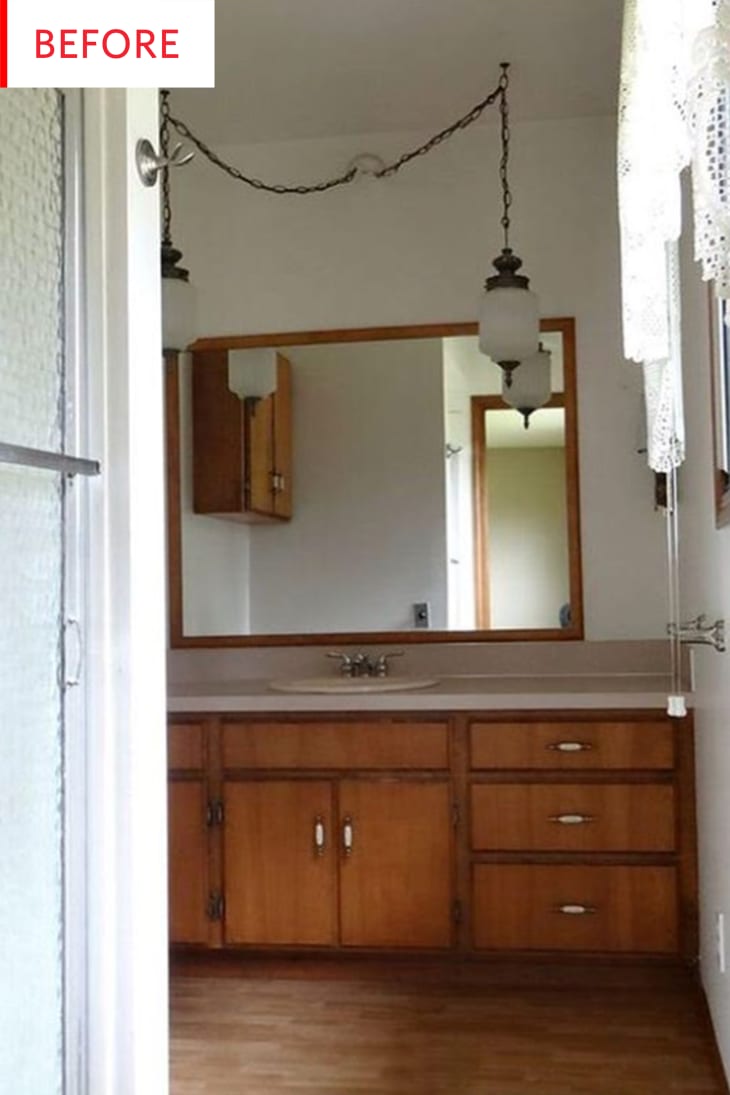 This bathroom definitely had a look going on: lots of wood, plenty of lace, and baroque lights hung from chain swags. But after one week of hard work, the room is now a pink powerhouse packed full of handmade touches.