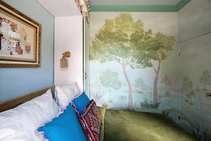 Artist Maggie Beckett had to rethink the bedroom in her 320-square-foot apartment when her boyfriend, now husband, moved in. When she lived alone (Apartment Therapy toured the home before!), the bed was up against the wall, which made it easy for one person to get in and out, and there was space for a dresser. However, it wasn’t working with two people, and moving the bed meant sacrificing precious storage.