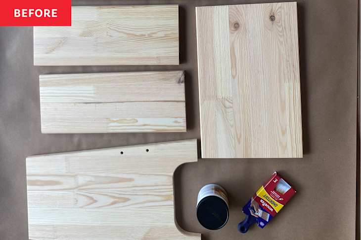 Since my nightstand pieces were untreated, I knew I’d need to stain them myself — and I went with a thrifty option. My family already had some stain left over from when they painted their fence, so I just used that. (The exact stain was Arborcoat Exterior Stain in the color Normandy, which is a semi-solid stain.) If you don’t happen to have any stain lying around, the small, 8-ounce sample jar I used retails for around $6 and is more than enough to paint an entire nightstand.