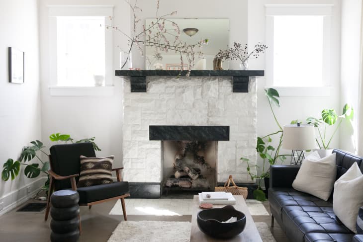 This hanging installation from Amber Thrane is perfect inspiration to reach for if your fireplace lacks a mantel (or if you want to add extra oomph above). Get the look by attaching a bundle of faux or dried grasses to a wood dowel, making sure to fluff up both ends for extra volume. Then, tie rope or cord to each end of the dowel before hanging. And bonus idea: If you don’t have a working fireplace, the hearth is a great place to display seasonal decor like this stack of pumpkins. Get the tutorial here.