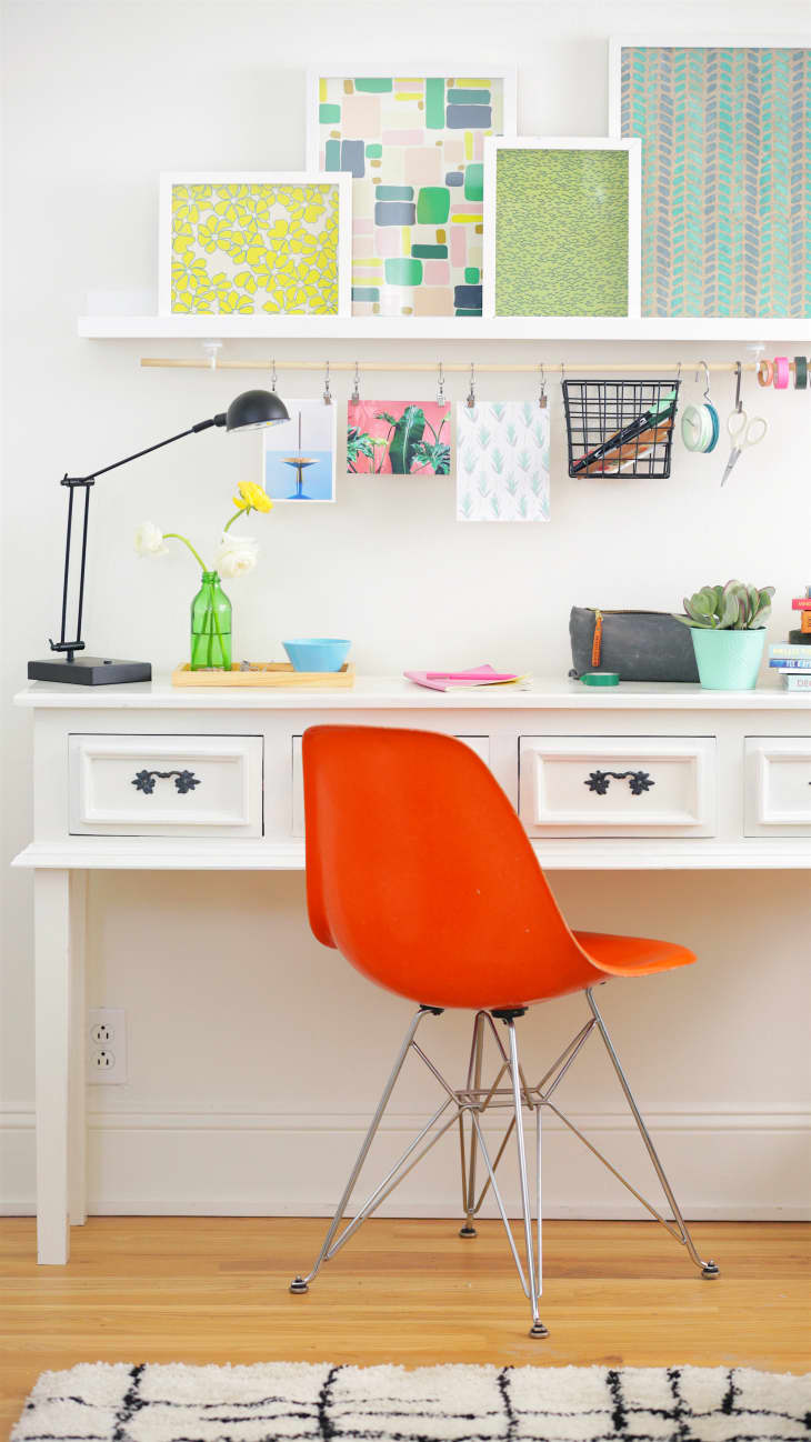 To fit a little more supply storage into a tiny work area, attach a long dowel to the bottom of a shelf (we got the 48-inch-long dowel, above, at Home Depot for just 88 cents!). First, secure two white ceiling hooks (we used these) to the underside of the shelf, about 40 inches apart, and suspended the dowel across them. Five minutes and $4 later, you’ll have a spot to hang up postcards, scissors and washi tape.