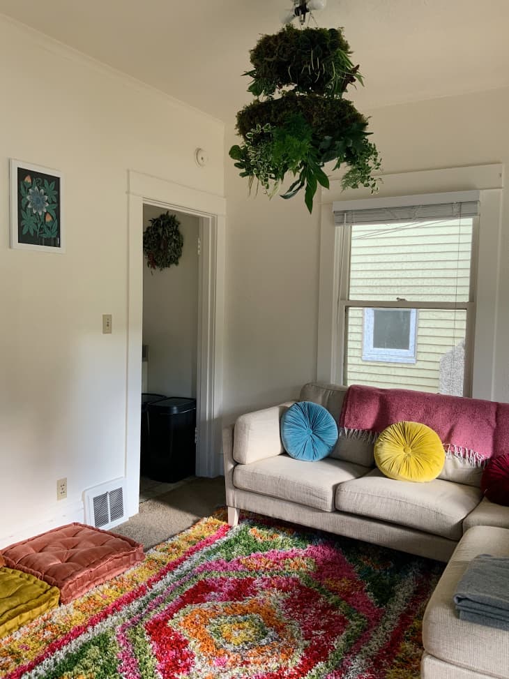 Once your plant chandelier is installed, maintenance is similar to other houseplants. “Take care of it by watering once a week to every 10 days,” Heddleston says. “Moss retains moisture very well, so it makes it easier to maintain. In between waterings, give the plants a spritz with a spray bottle to keep leaves moist and happy. Then, about once a month, take the structure down and give it a really good hose off.”