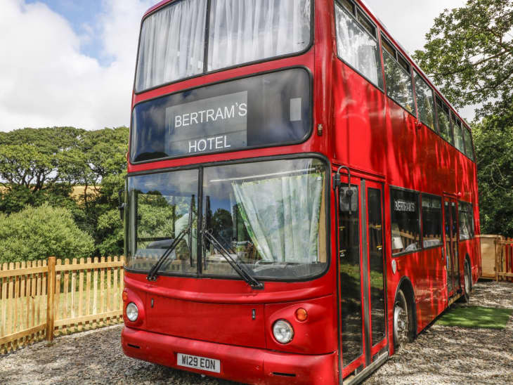 Sykes Holiday Cottages’s bus-turned-hotel listing is complete with two bedrooms, one bath, and a kitchen and dining area. Enter through the glass sliding doors into the ground floor that has two twin-sized beds, a quirky shower room, and a classic cocktail bar. Then hold onto the gold railing and make your way up to the second floor, where you can fire up the gas oven, cozy up in front of the vintage telly, or take a nap in the “master” bedroom a.k.a. the double bed.