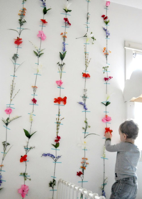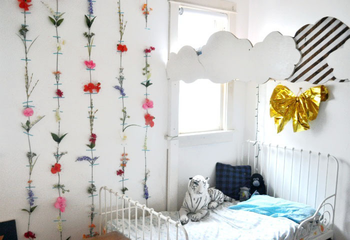 The cloud bed is everyone’s favorite, but I’ve discovered I like the big blank wall the best. It allows me to change the room with the season. There really isn’t the option of rearranging the furniture in this room, so switching up projects on the wall makes the room seem new again. The waxed leaves we did in the fall was my favorite project so far, but the Christmas tree was good too, and I love the flowers now. I guess I like them all!