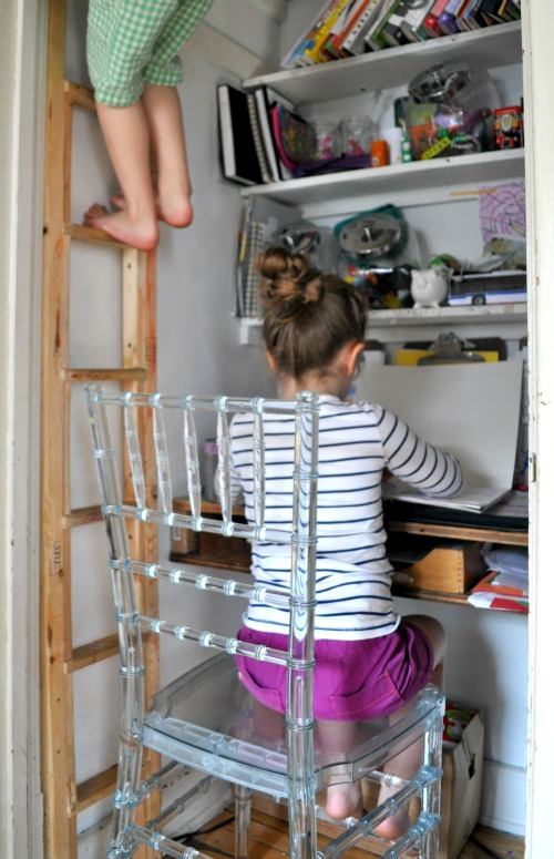 Confronted with the challenge of making a small closet work for three kids, Meg made the strong choice of ditching it altogether. Off came the doors and in went an art studio, constructed with cloud bed leftovers. Each child has a dresser drawer and they all share the fourth. All remaining clothing and stuff is tucked away in abundant stealth storage. Linens are stored under the crib along with dolls and puzzles. The hairpin leg ottoman serves as a toy box, and dress up clothes and PJs belong under the twin bed. The underbed storage systems consist of vintage boxes on casters and a rockstar road case found on the side of the road. Here’s what Meg told us about bringing together this incredibly thoughtful and fun room for her kids.