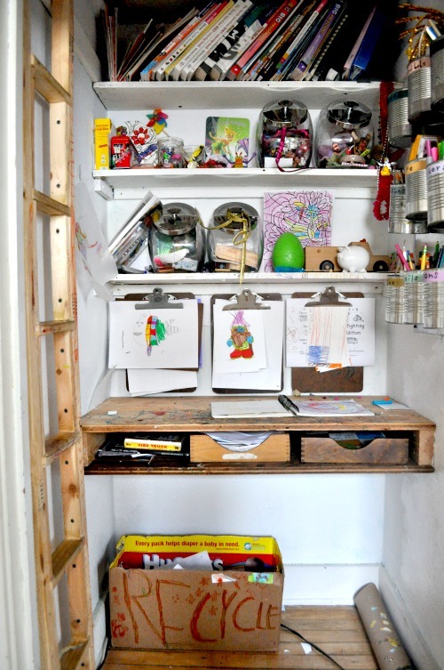 Inspired by another 3-in-1 kids’ room she saw on Apartment Therapy, Meg was certain that she could make this space work for three kids to coexist comfortably with room for a desk and a dresser. The starting point was the spectacular cloud rail loft bed that Meg enlisted her carpenter brother to make. That’s where the five year old sleeps, and big sister sleeps on the IKEA bed below. Baby brother’s crib is opposite the clouds. The white changing table has a little surprise when the drawers open, and wooden boxes hold useful stashes in the storage shelves overhead.
