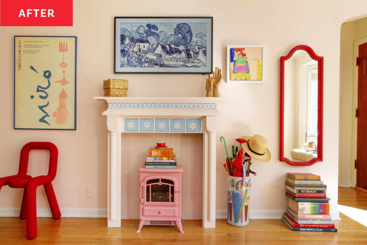 When everything store-bought was looking a little too new for her taste, Ashley decided to upcycle an $80 antique Facebook Marketplace mantel and add a space heater she already owned (and painted bubblegum pink) to create a cozy, eclectic look.