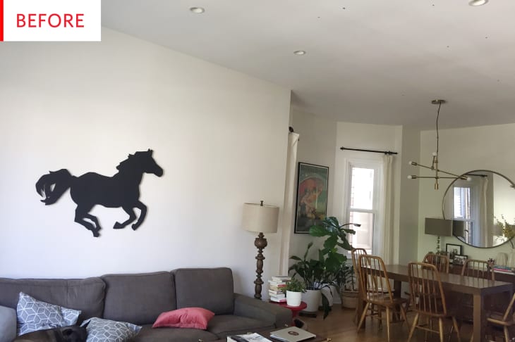 This open-plan living and dining room had tons of charm: A graceful chandelier, attractive and comfortable furniture, lush plants, and lots of natural light. Its owner, however, wanted to added a little something extra—that je ne sais quoi that would elevate the space.