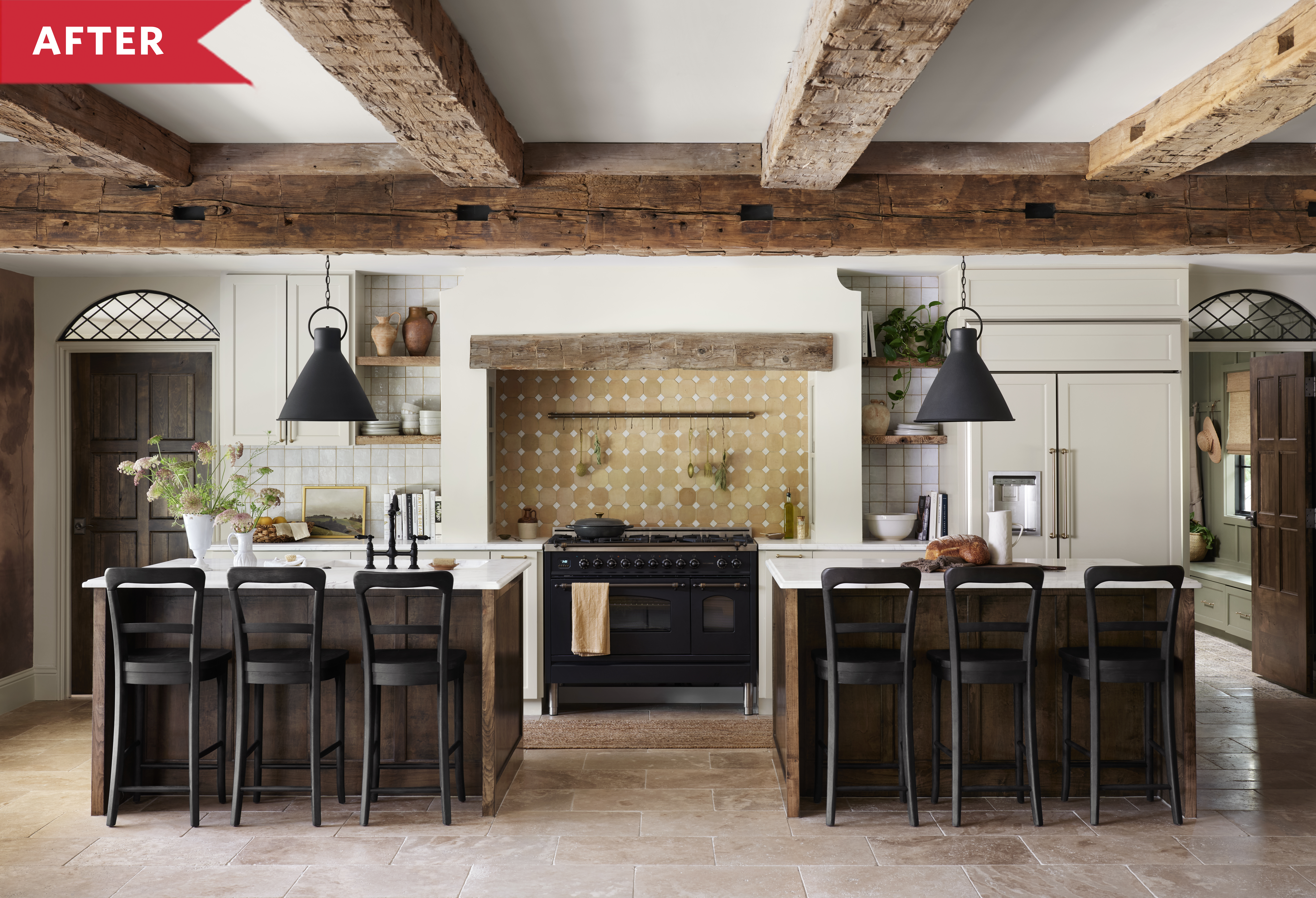 To open up the kitchen, the Gaines knocked down the wall separating it from the living room, making it more of an open concept. They replaced the old island with two new ones, adding ample seating for family gatherings. Joanna added a backsplash tile behind the range that brought in some of that Mediterranean warm, with a wooden beam on top that matched the ceiling beams. The space was complete with new white cabinets, appliances, and wall tile.
