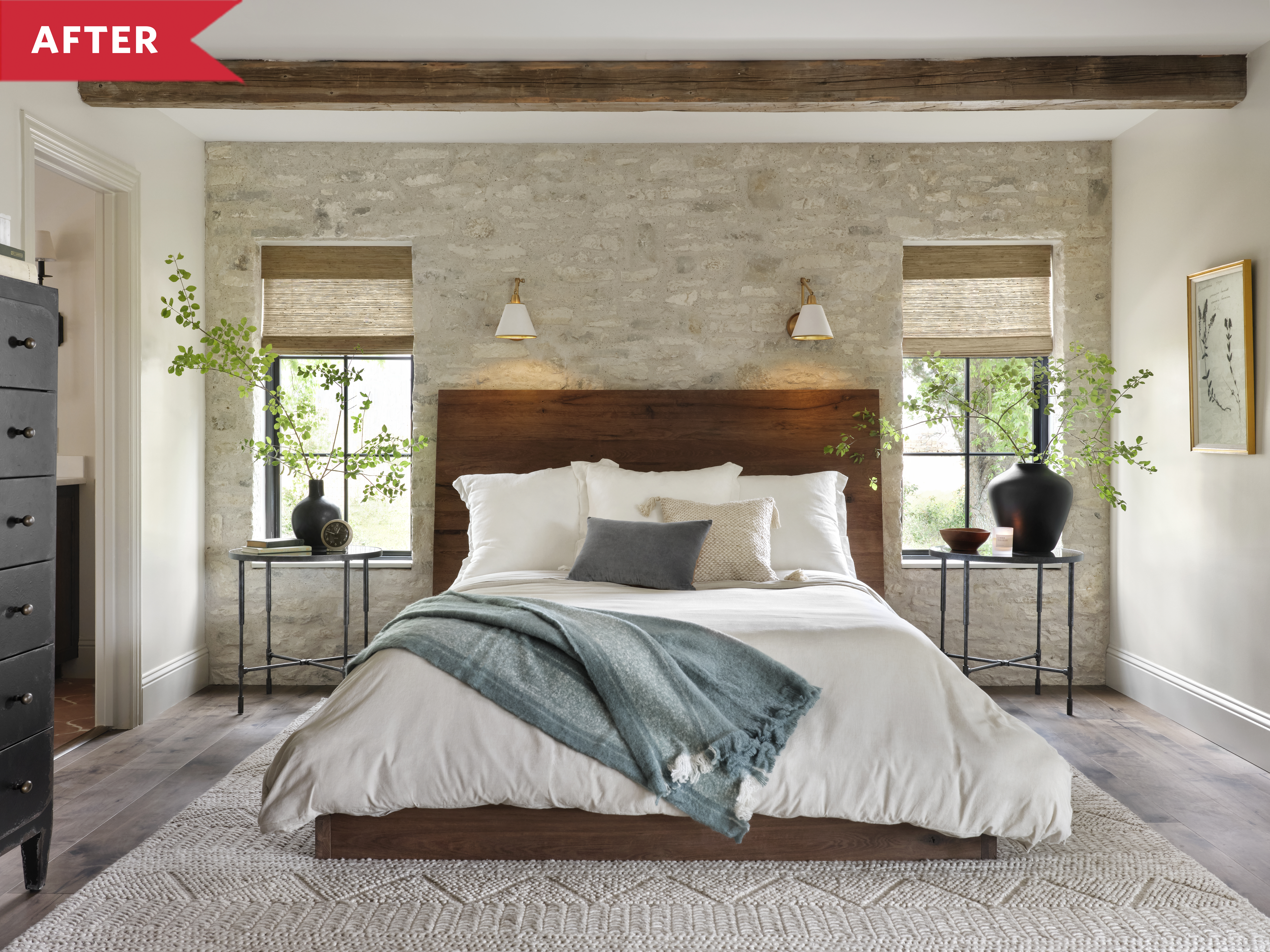 To tie the bedroom in with the rest of the home, Chip and Jo built a stone wall that was similar to the one in the living room. They incorporated those hand hewn beams into the bedroom as well and installed some new windows that balanced out the light in the space. Add a massive textured rug, natural wood headboard, reading lights, and some plants, and David and Christina had the zen-filled bedroom of their dreams.