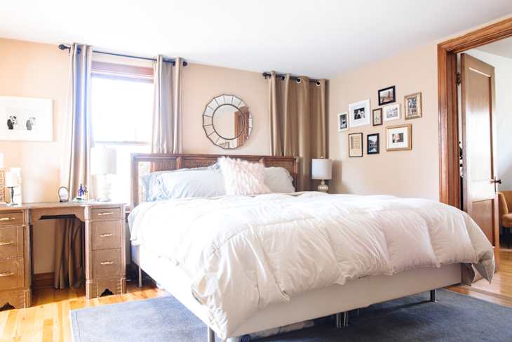 This one might be a bit tricky to pull off, especially if you’re currently living in the space or if you’re just trying to do a free refresh of your space. But an easy way to make a bedroom look bigger and feel neater is to remove any extra furniture that you can.