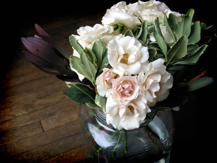5. Find something spiky, edgy, or slightly offbeat. These roses made me think of hothouse flowers, lush and romantic. I knew they would mass into a tight, creamy bundle of petals, with the greenery as background for their pale colors. That could have been enough, but I wanted one more piece to cut against the romanticism and provide contrast. I chose a bundle of Safari Sunset — another hardy grocery store staple that is exotic and interesting. Its burgundy color, however, beautifully complements the pale pink roses, and its shape is echoed by the sprays of pittosporum. I tucked it into the sides and back of the arrangement, where it shoots off and draws the eye into negative space.