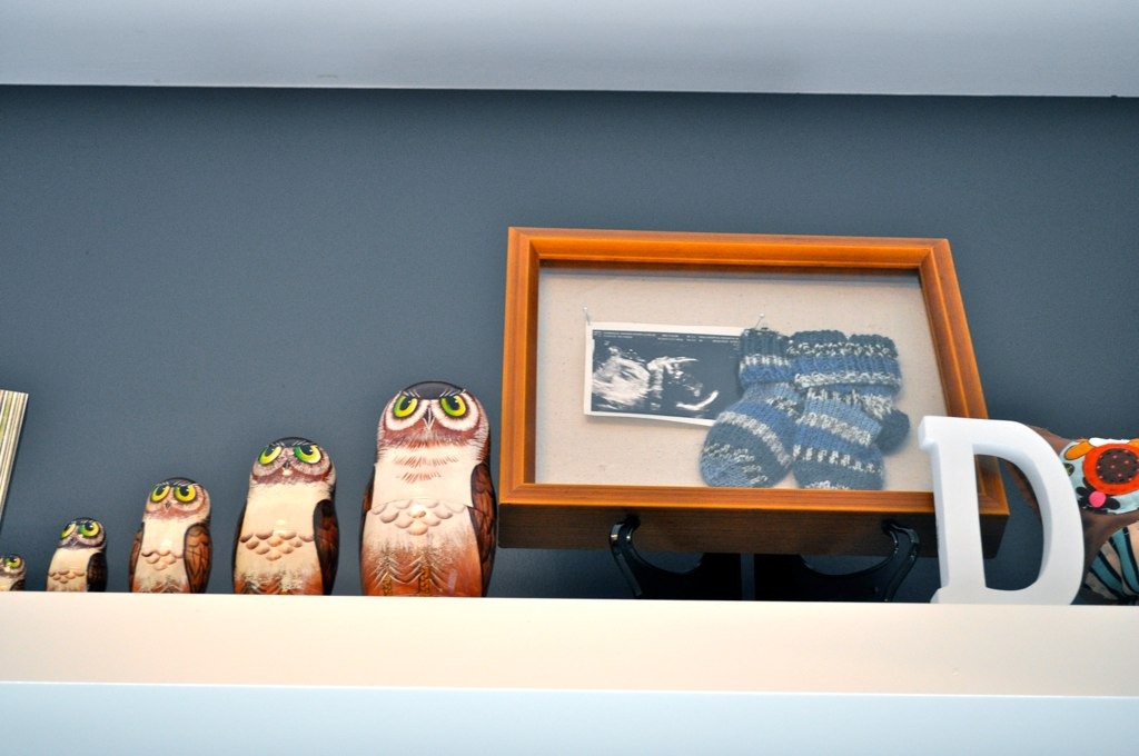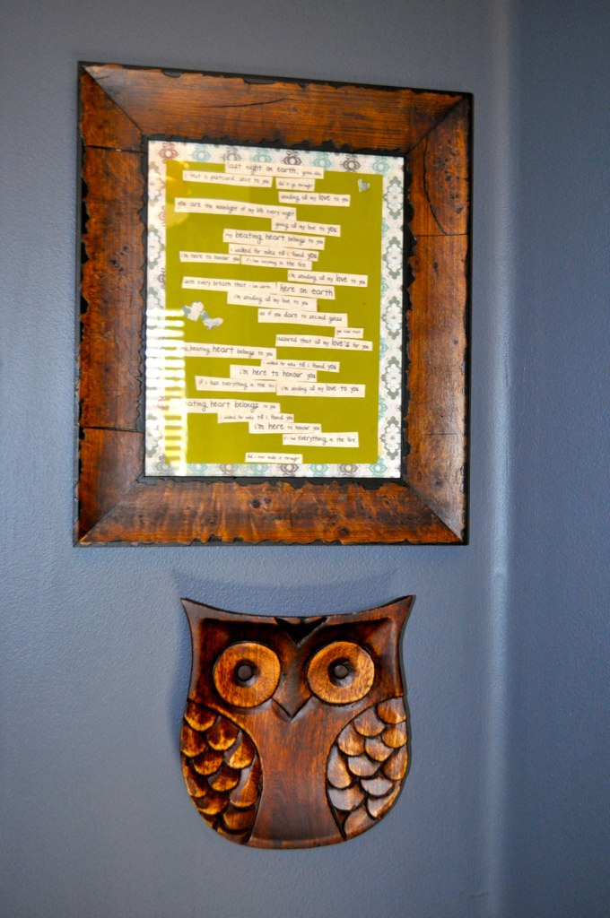 I really love the impact of the West Elm ceiling light fixture. However, I especially love the personal touches in the room. We have a hand-painted tree with thumbprints of those who attended the shower for “leaves”. We have owls we bought in Russia for him. We have my favorite Green Day song which I made into a framed lullabye and hung on the wall. All of these make the room personal and less “show room”