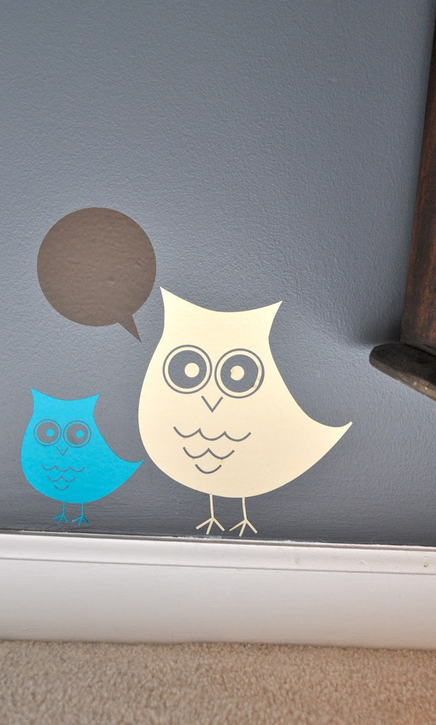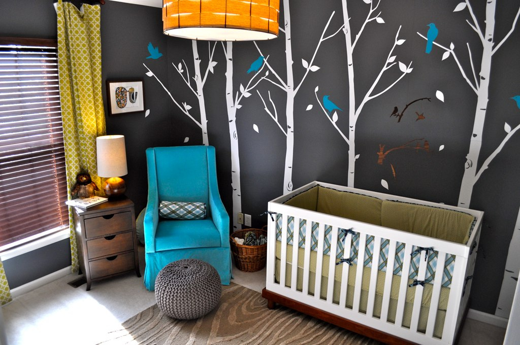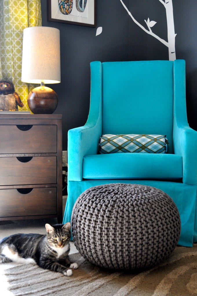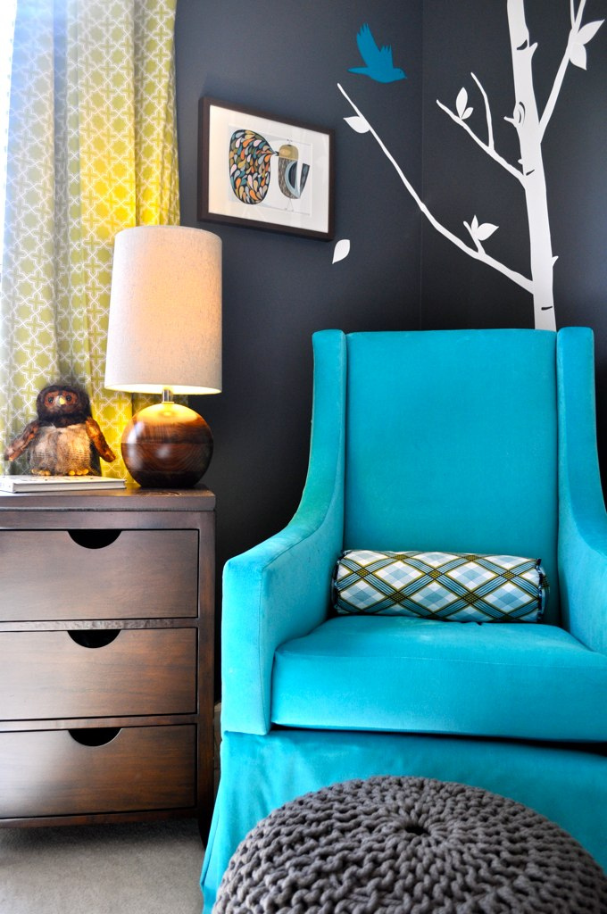 I actually didn’t start with the theme. I started with color and the theme evolved from there. I knew I wanted these bright greens and blues to pop off of the dark gray, but I needed a neutral to tone everything down. I ended up with this brown color in the woods of the dresser and the bottom of the crib. From there “wood” became an accessory in the room. The wood grain is in the rug, the lamp and the ceiling light. From use of the wood, the “woods” theme was born. I think if I started with an “owl” theme or “woods” theme, I would have been bogged down by that when purchasing accessories.
