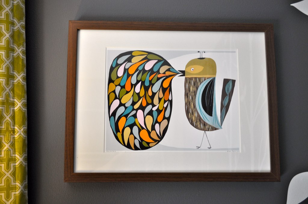 It’s a weird term for a baby’s room, but I’ll call it moody. The dark walls give it a really interesting sometimes mysterious look. But the bright colors popping off, I think give it a more playful feel as well. I love the combination of the two.