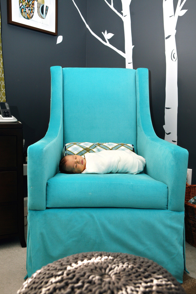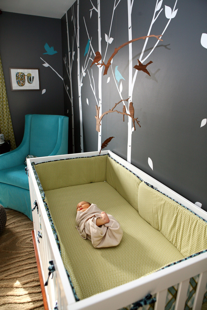 When Amanda entered (and won!) the Small Kids, Big Color contest, we all followed her into the woods and agreed that it was indeed awesome. The contest’s five photo limit left many of you, not to mention us, craving more of this memorable space. Amanda and her husband welcomed the room’s occupant, their son Gavin, into the world less than two months ago and she graciously spared a few precious minutes of new mom time to tell and show us more.
