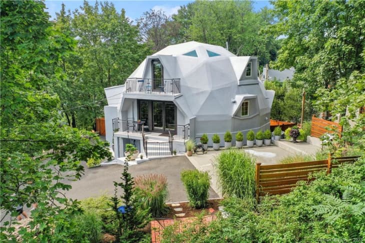 When selling your house, it can be easy to get swept up in curb appeal, figuring out how to make your place stand out among the sea of Zillow listings. The lucky new owners of this geodesic dome home, though, will have no problem. Clad in gray stucco and featuring five separate terraces and many gabled windows, this rounded house is ripe for pareidolia, a.k.a. that fun phenomenon of seeing meaningful shapes in random patterns, like faces in buildings.
