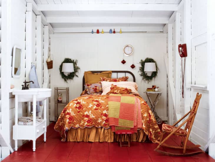 Decorative wreaths come in many different sizes and materials, but one thing remains a constant: The place where you’re most likely to hang one is probably on the front of your door. Sure, you can branch out with one over a mantel or even on top of a mirror or window. Maybe you’ve even used one on a table as the base of a centerpiece or to set off wall sconces, as shown in the bedroom above. The front door, however, has remained the top spot for centuries; there’s even evidence that suggests olive and laurel wreaths were hung on doors in Ancient Greece as offerings to the gods to ensure a good harvest.