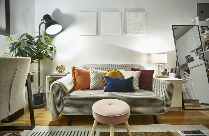 When it comes to pulling things together in her apartment, Mendes has a self-proclaimed “anything goes” mentality that still manages to look flawless and put-together in the end — and her living room curtain situation is a perfect example of that polish. Instead of using nails to mount a curtain rod above her windows, she positioned a tension rod within the window frame to hang up curtains. That way, she gets a nice pop of color and texture in her place without having to use any tools or make a major investment in curtain hanging hardware that might not fit her home if she relocates one day.