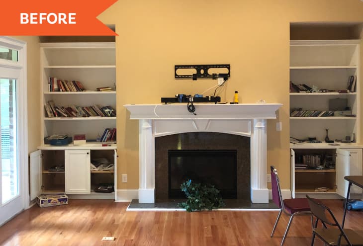 Her approach is immediately clear in the living room, which featured the same dingy yellow walls, as well as exposed wires and hardware from a former wall-mounted TV. These elements eclipsed appealing aspects like the dual built-in bookcases, a sizable fireplace, and vaulted ceilings.