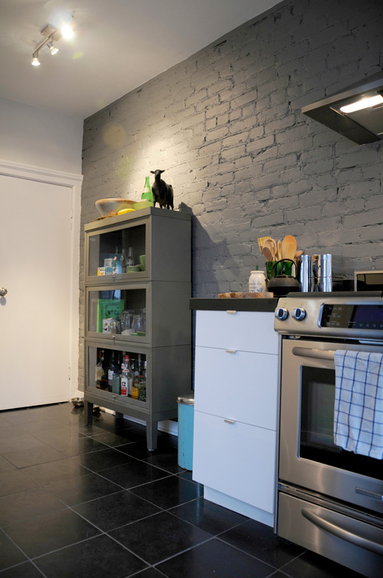 Part well-curated oddities shop, part clean-lined, vintage modern inspiration, Amy and Stéphane’s home is perfectly suited for the performance and design oriented duo. When they bought less than two years ago, the kitchen and bathrooms required major rehauling, but care was taken to retain the integrity of the space. While open concept renovations are au courant, these two knew that preserving the original layout worked better in the space. In the kitchen, modern Ikea cabinets and stainless steel appliances mix with aged exposed brick and vintage accessories like the aqua blue garbage bin and antique sugar bags, while in the bathroom hex and subway tiles live next to sleek new fixtures.