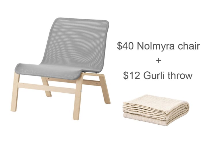 The Ikea Nolmyra has so much potential. Great lines, perfect scale, cool bent plywood legs. But with that stock gray mesh cover, it’s a like a sexy foot stuck in a dirty running shoe. You can easily upgrade it, though. Just toss a $12 Gurli throw into your Ikea cart, and we’ll show you how to give this cool little lounge chair a whole new look.