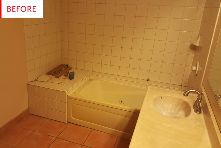 You had to squint really hard to see the potential in our master bath, but it was there. The room always smelled of mildew, and a defunct, brown jacuzzi tub that created an electrical liability kept us from using this bathroom for nearly two years after we moved in! TWO YEARS! But every so often, we’d go in there just to dream about what it could be.