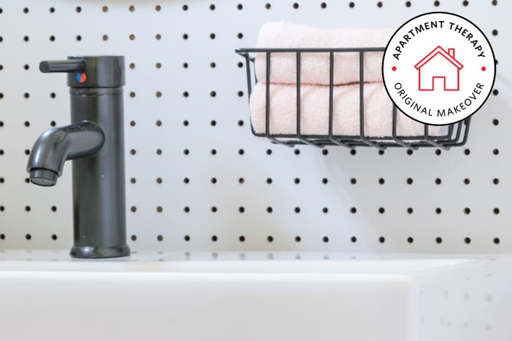 There are two parts that you’ll need to connect under the sink: 1) the faucet supply lines, which are the smaller twin pipes to the right. (Usually faucet supply lines come out of the wall as well, but in this bathroom, they came up through the floor); and 2) the main drain pipe (the thick one sticking out of the pegboard wall on the left).