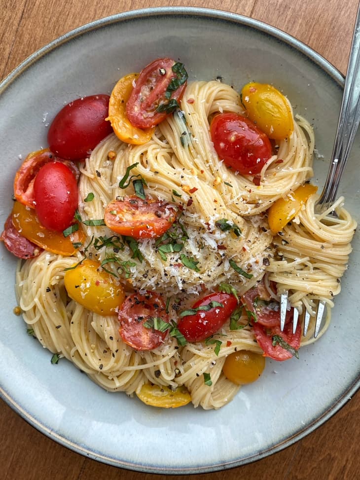 To make it, combine halved cherry tomatoes, a generous glug of olive oil, garlic, chopped basil, salt, red pepper flakes, and pepper. Cover the bowl with plastic wrap and let it hang out on your counter for four hours. As the tomatoes sit, they take on the flavors of the garlic and basil and become saucy and tender. Once ready, toss them (along with their juices) with hot, cooked angel hair pasta and garnish with Parmesan. It’s light, simple, and the epitome of summer.