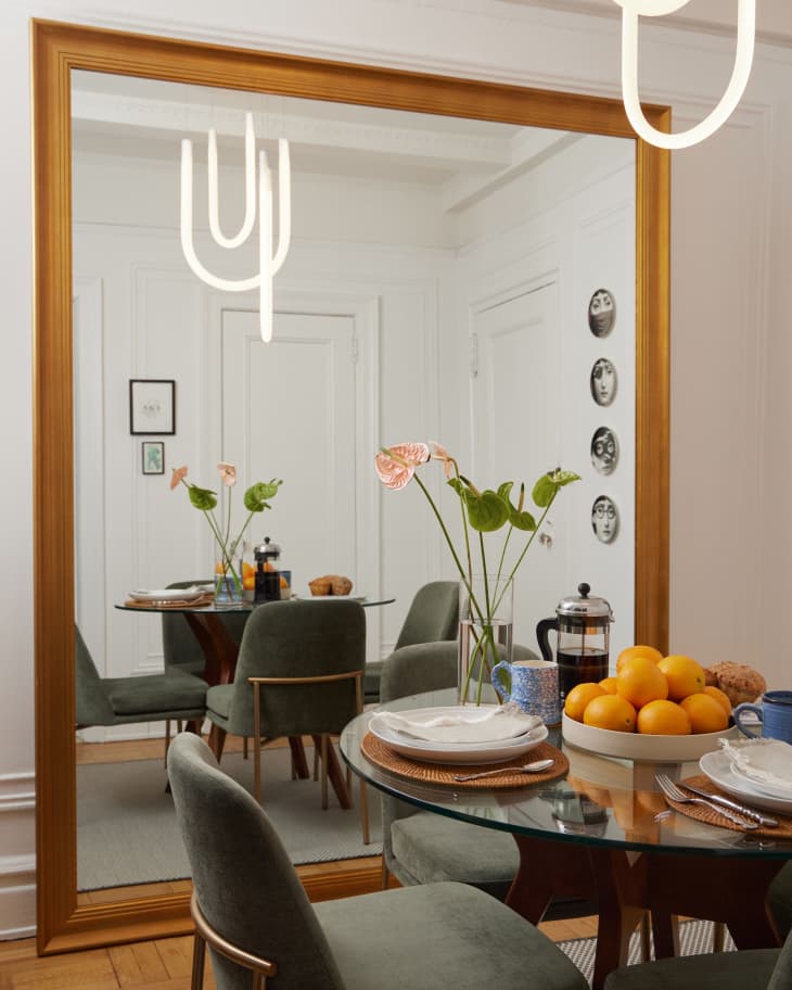 “We added in a West Elm set of table and chairs and my great grandma’s dining room hutch, which has now lived in three family homes in New York State. It was kismet that August’s love for green and my family’s hutch all worked together so well,” Poser described the dining room during the home tour. “The space is finished off with some artwork and an indoor/outdoor rug (a great trick for high traffic interior spaces) to define the space.”