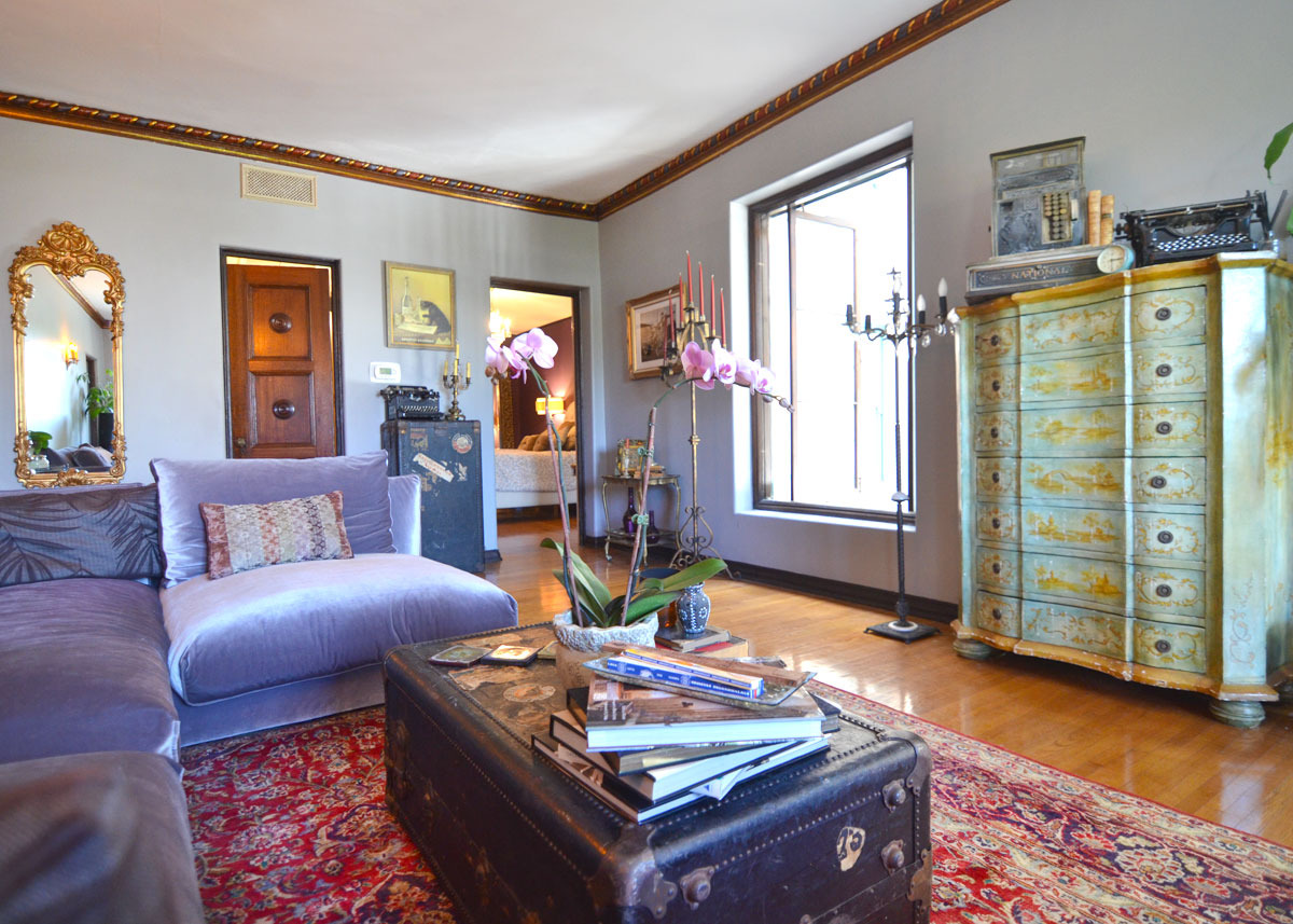 Bette Davis, Marion Davies, Mae West, Ava Gardner, Douglas Fairbanks, Clara Bow, William Randolph Hearst…a who’s who of Hollywood royalty that once called the historic Los Altos apartments “home”. Now the tony address is home to events planner and vintage design specialist, Jennifer Laskey and her feline sidekick, Capone. The pair share a romantic apartment embellished with the finer details of a bygone era, with the spirits of Tinseltown’s past still haunting the hallways…