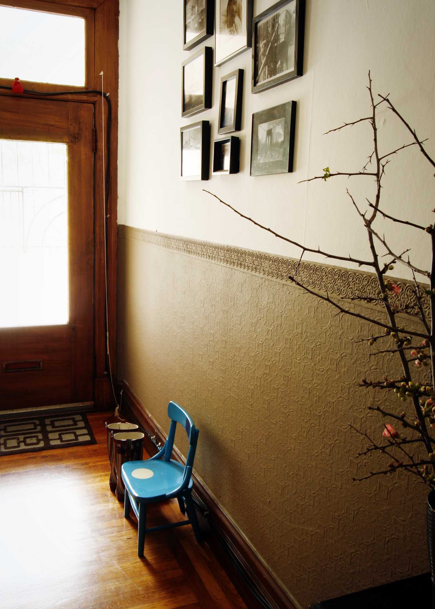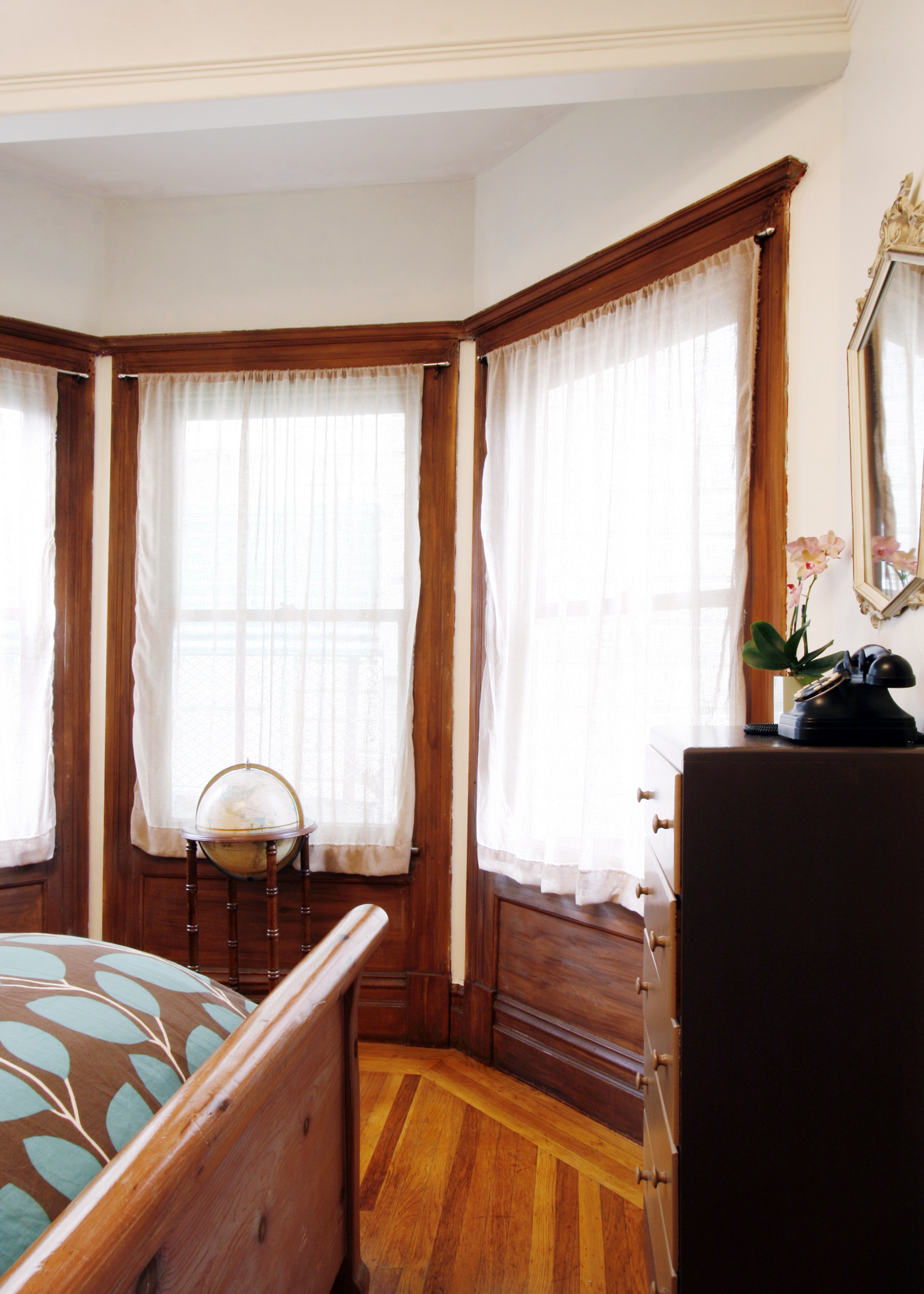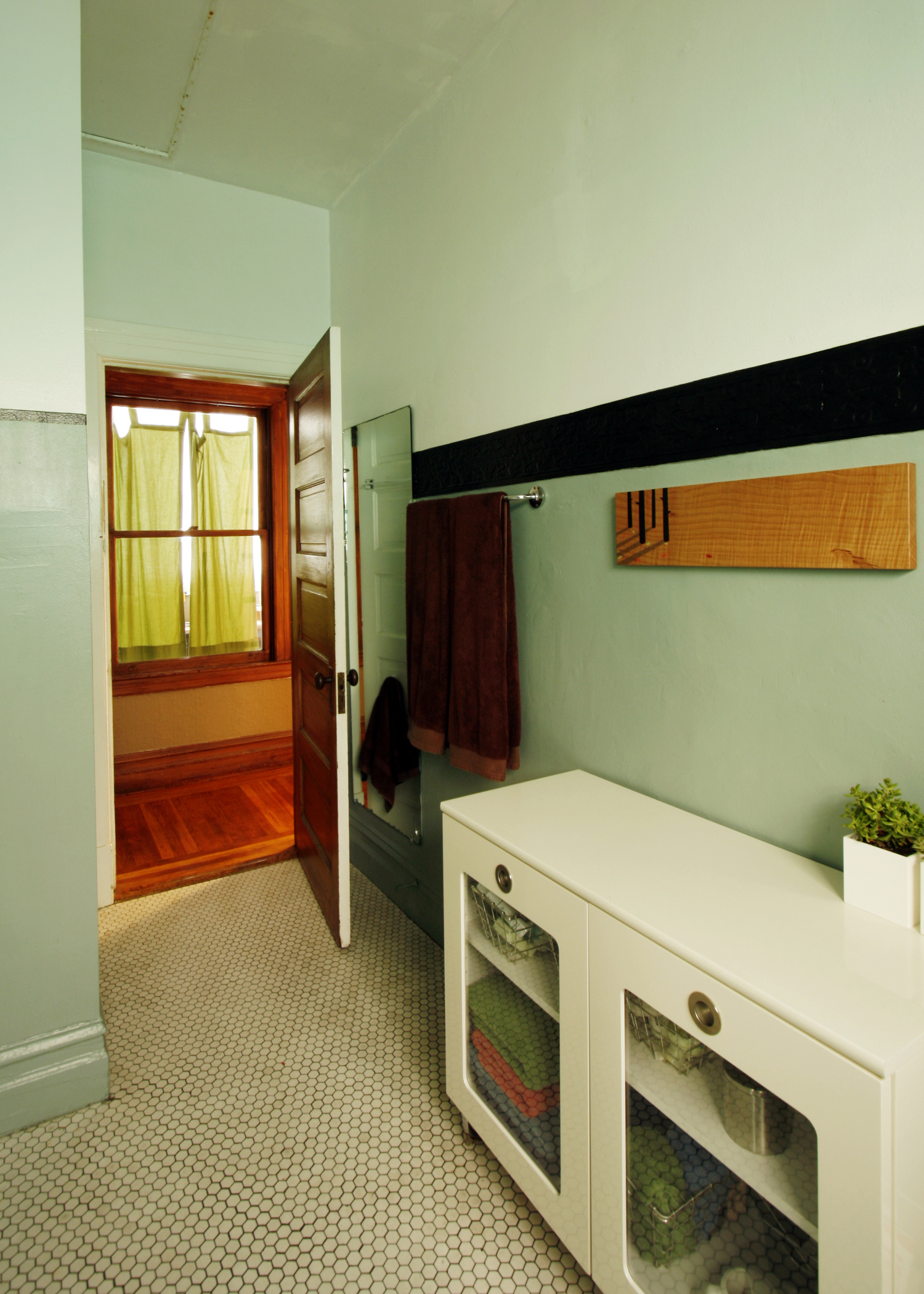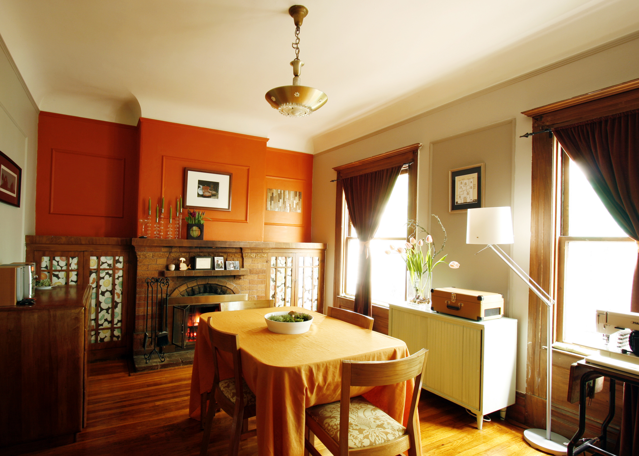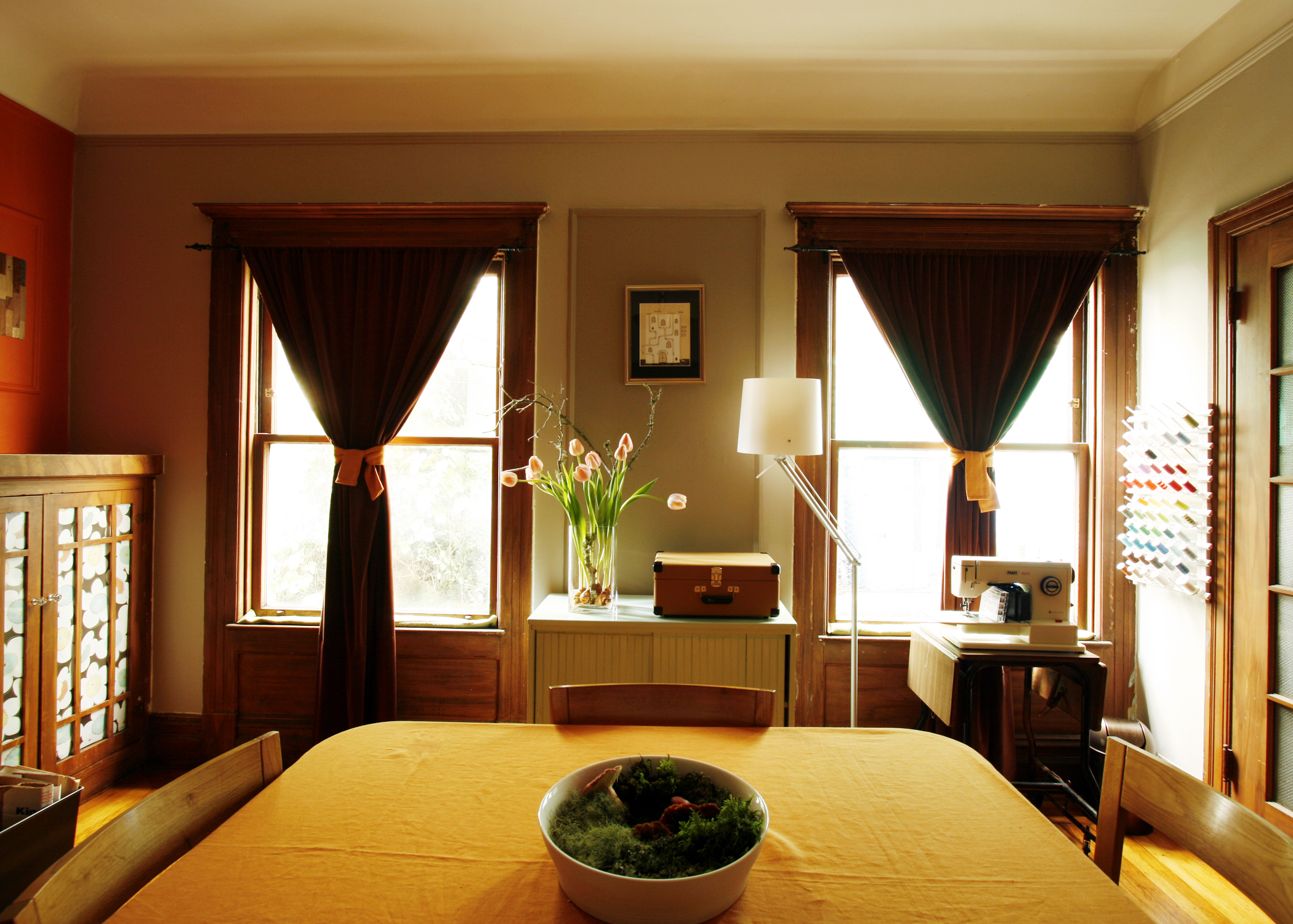 Jenny and Cristina are an extremely creative, crafty and busy couple. Besides their day jobs, Jenny makes handmade organic baby quilts for her company Ciuccio Baby and Cristina plays in a band and runs The Heated, a thriving screen printed tea towel business. With all that goes on within their home, it’s a necessity that is stays so well organized. Their craftiness (and appreciation for all things handmade) is apparent throughout. Most of the art adorning their walls is from Etsy sellers. Jenny sewed nearly all of the pillows and curtains herself. Cristina, the handy woman of the house, takes care of all of the fix-its needed in this century old apartment. They have also repainted every room in the house save the lovely textured wall in the entryway. Still, they have yet to replace any light fixtures that require rewiring, as the antiquated wiring makes them nervous.