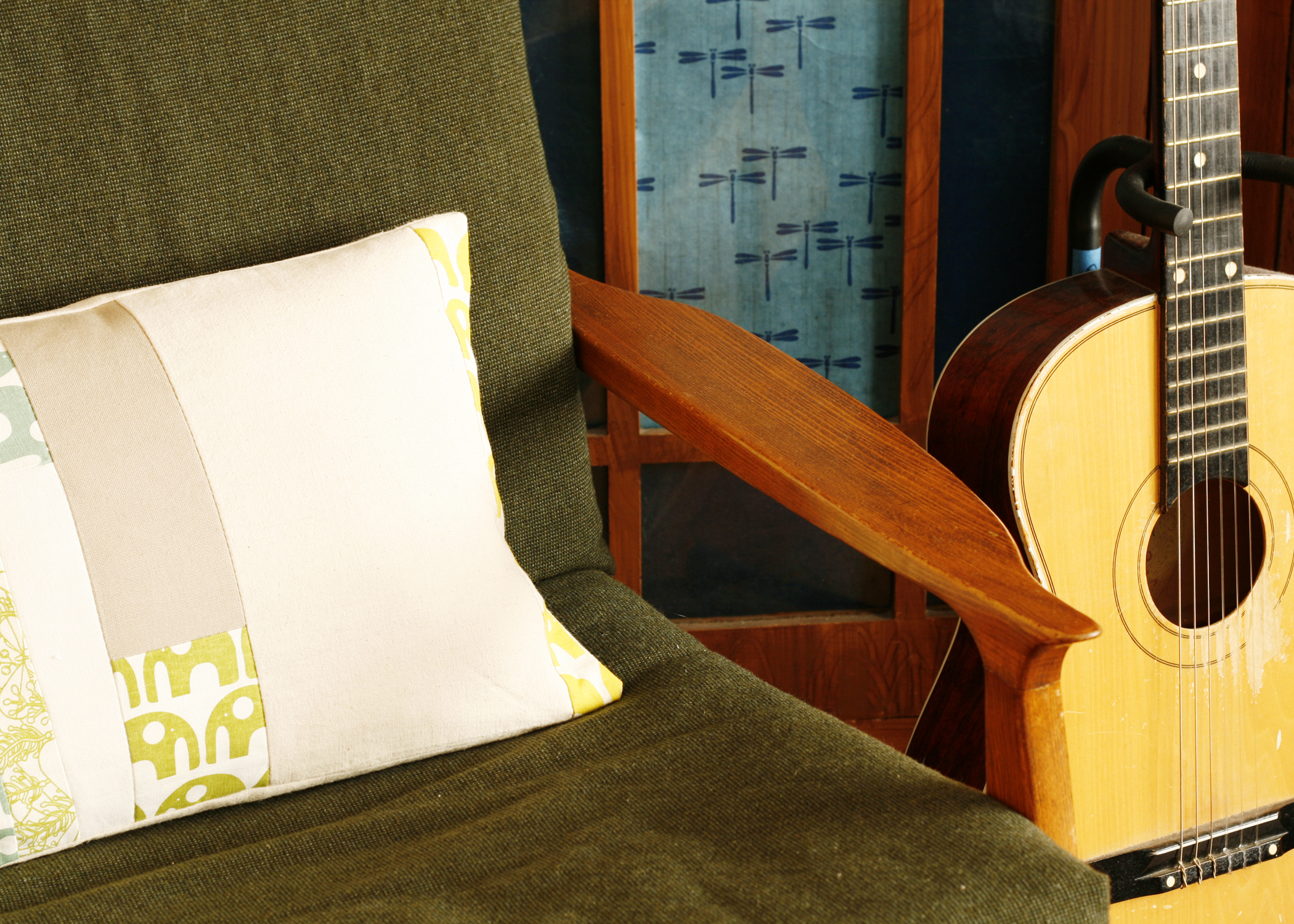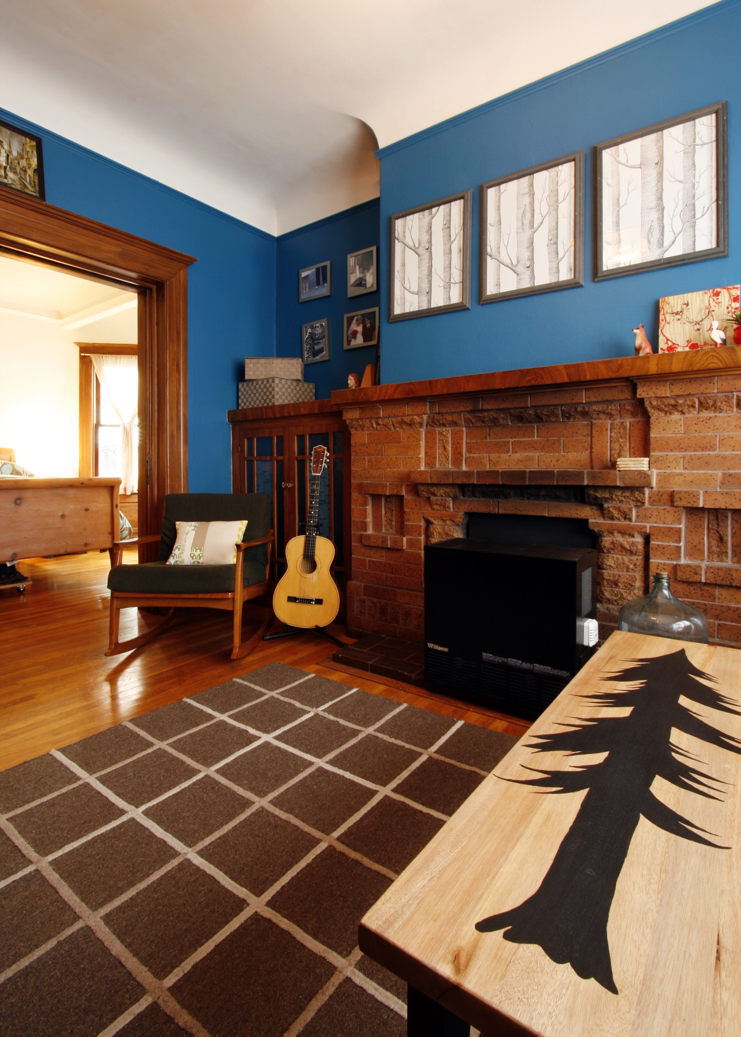 Living Room: Marimekko fabric – Repro Depot; SF district poster – Ork Posters; Deer art – Sita Rupe, Dog portrait – Jill Pilotte of small stump; Tree wallpaper – Cole and Sons; Coffee Table – Pottery Barn (stripped and painted by Cristina); Birdcage – bought at Candystore (vintage from Vietnam); Paper lining built-in – Flax; Rocking Chair – Eames Loft; Wall color – Benjamin Moore (I think it was called Deep Marine)