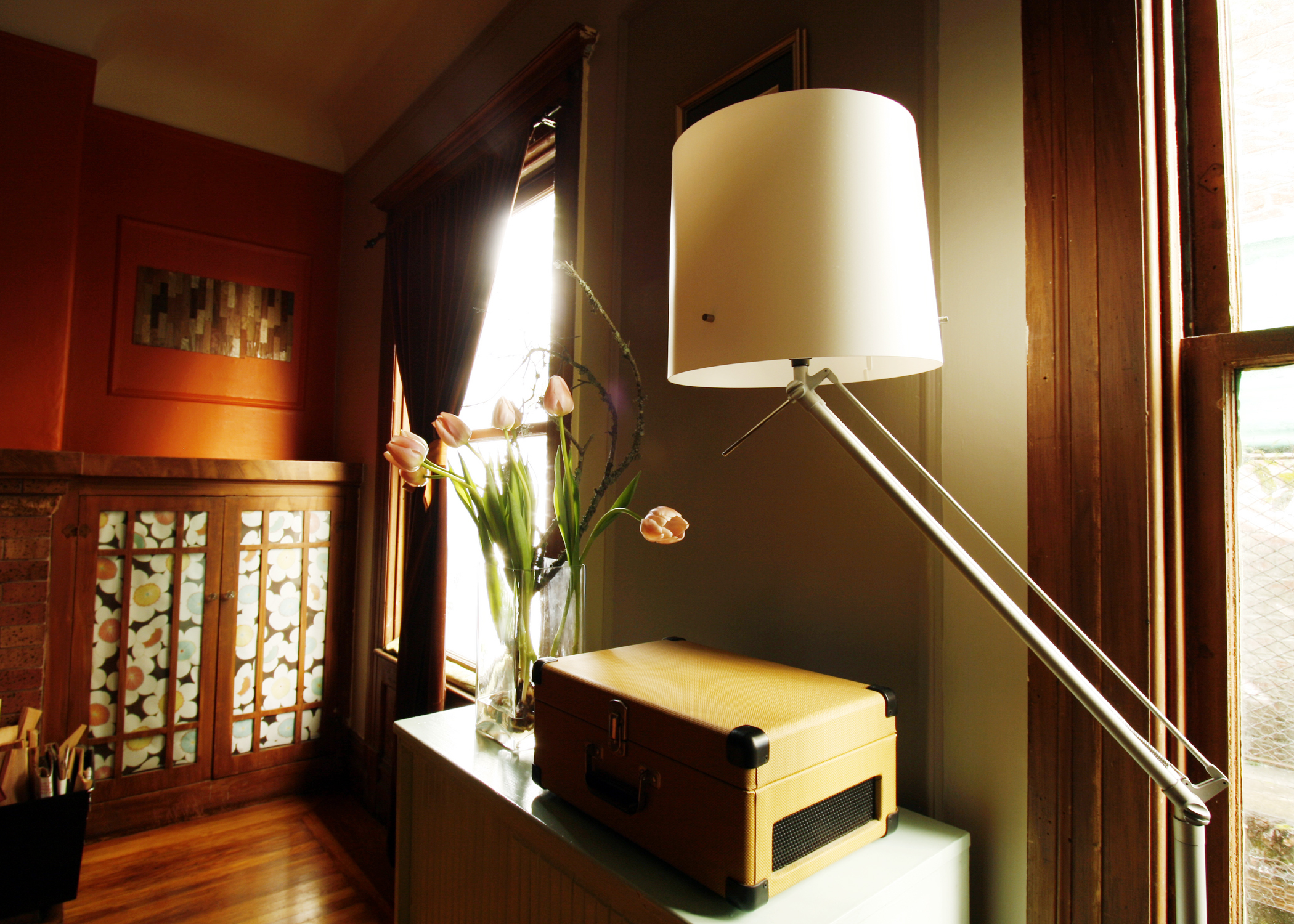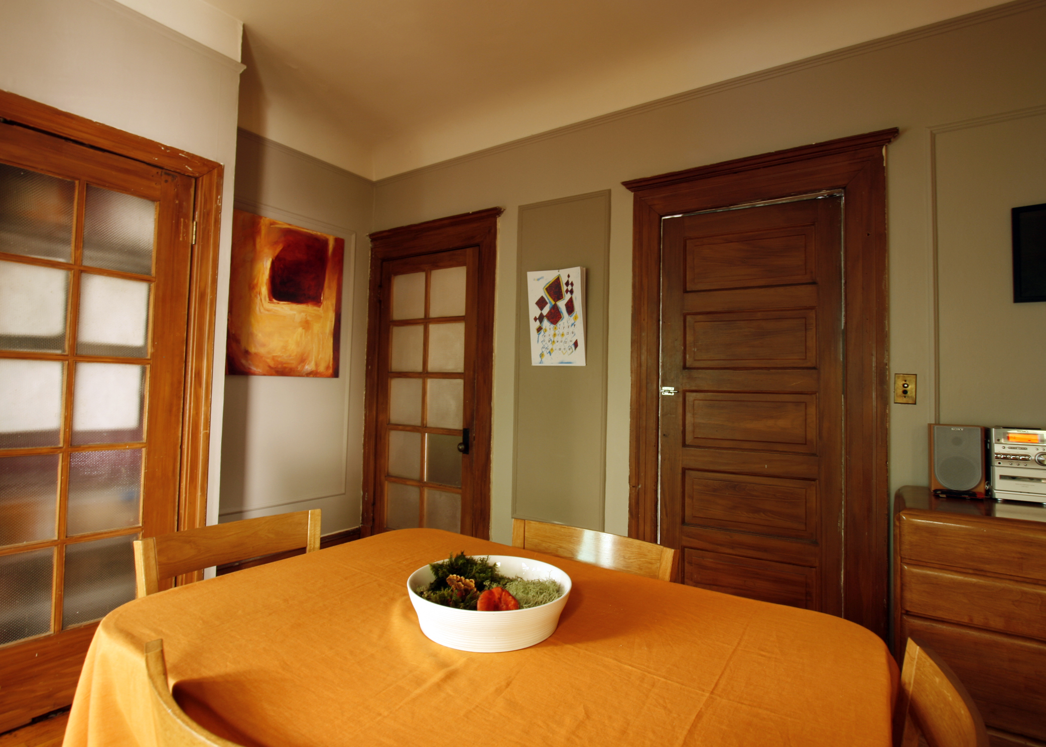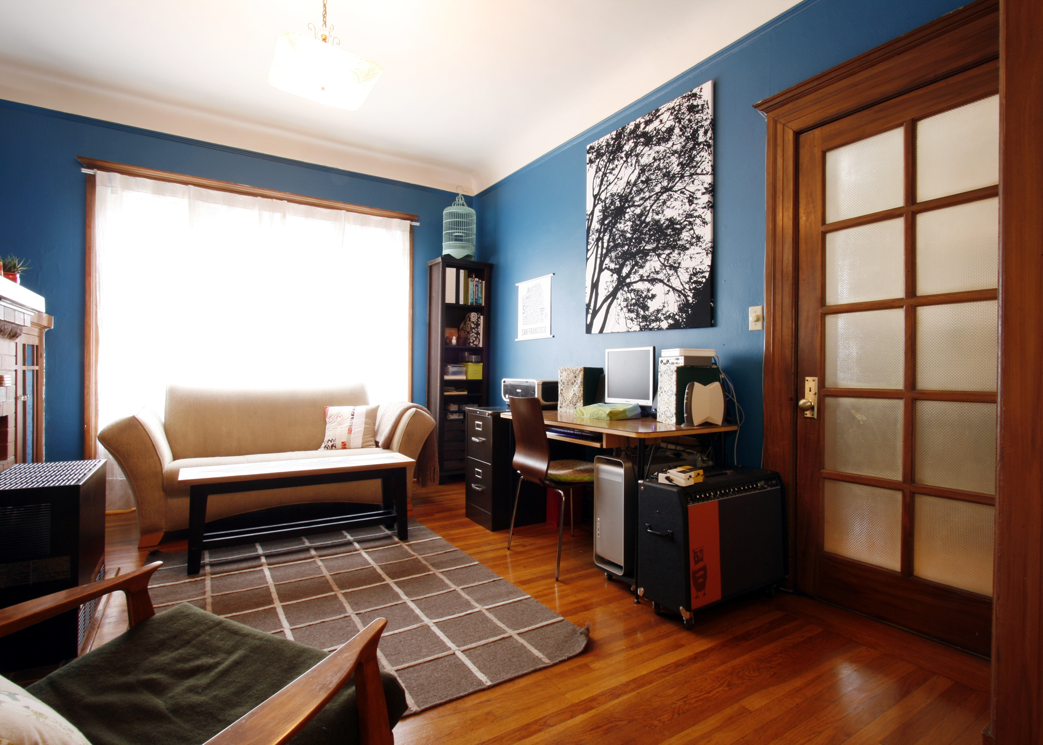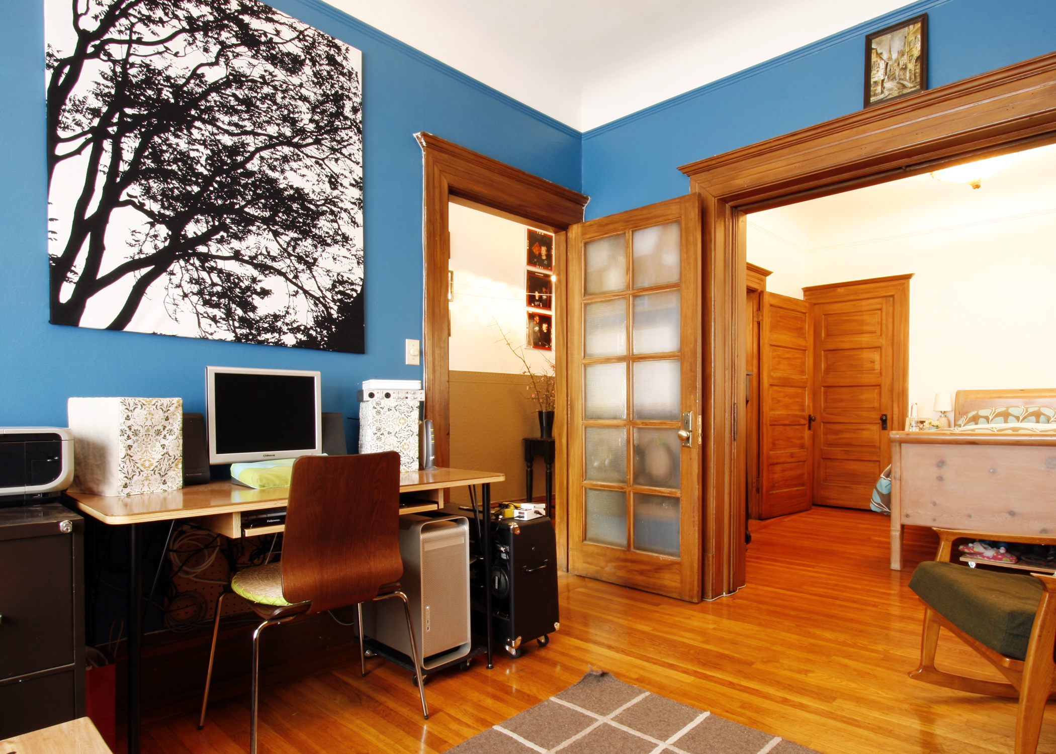 Biggest Challenge: Ultimately it’s space. Every room in the house has at least 2 doors, windows and most have built-ins. This really limits the way we can arrange things. We also each run our own businesses so dealing with space for all that goes along with that can be hard. The electricty in our house hasn’t been updated in a long time. We have only 1 outlet in most rooms. They are threashed and not very safe. The computer and all Cristina’s music eqipment is plugged in to the only grounded outlet which is in the little room off the kitchen. Look closely and you’ll see cords running in crazy places.