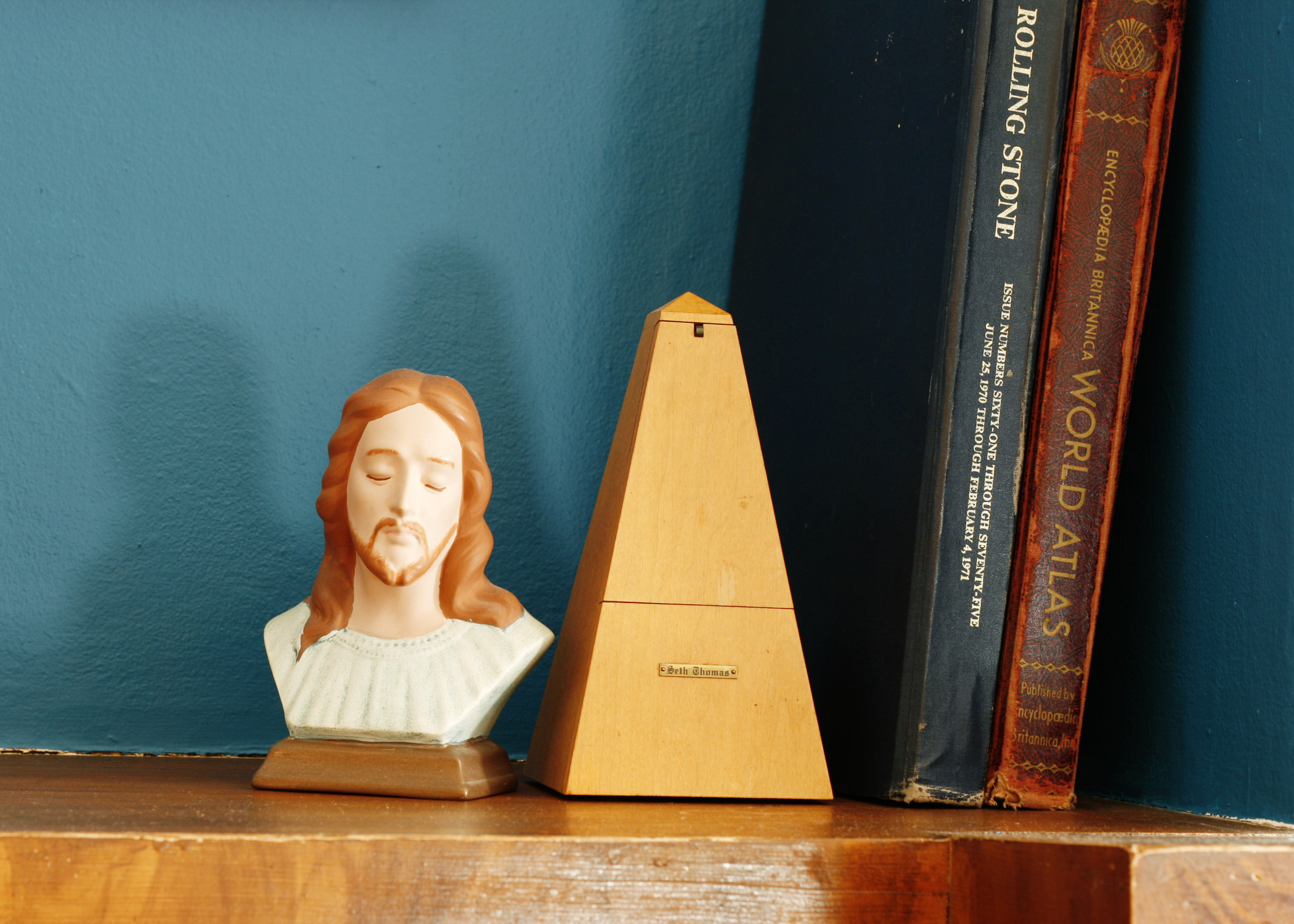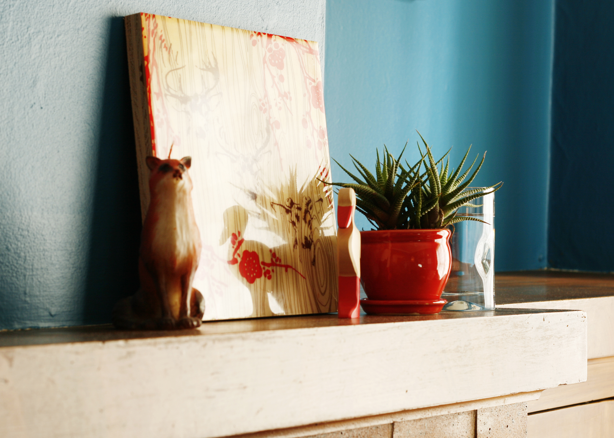 “Waiting For Love” chairs photograph – Jose Lampreia (Etsy); Wood Whale and Wood Veneer – Cristina; Wood Apple – Miss Natalie (Etsy); “Raincollector” print – Sea Spray Blue (Etsy); Abstract Painting – Elana Kundell; Houses print – Tiny Sparks Design; Cabinet – Candystore (vintage); Mid-century dresser – Craigslist; Candle holders – CB2; Hourglass – Belle Jar; Wall color – Benjamin Moore AC-34 cape hatteras sand/accent frames BM AC-36 shenandoah taupe; Mantle color – Benjamin Moore 2167-10 burnt caramel