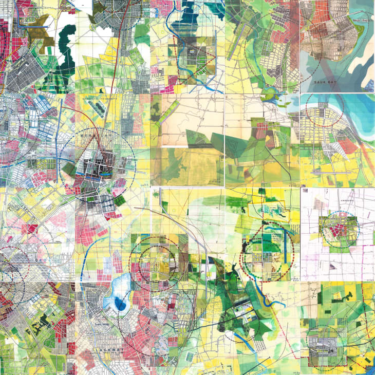 I got lost in the piece, peering in at minor details — a train station and converging tracks here, a cluster of houses there, a scrap of newsprint that’s meant to be a farm or a factory — and then stepping back to take in the swirling, abstract artfulness of the larger landscape.