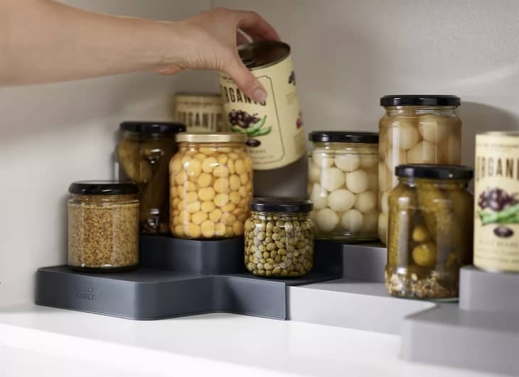 While most tiered shelving inserts and spice racks give you a fixed amount of storage space, the Expandable Tiered Organizer from Joseph Joseph (one of our favorite places to find stylish and functional kitchen gear) lets you decide how much storage you want to have. It does this in a refreshingly simple way — one side slides under the other — so you can change the width of the entire unit to be anywhere from 16.5 inches to 24 inches wide. That means it will work in any sized kitchen and actually adapt to your storage needs as they change from season to season or year to year.