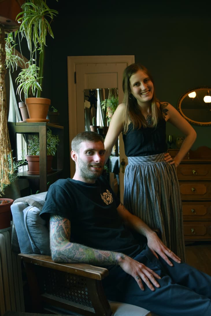 “This is our birdhouse,” says Kaelie — a medieval birdhouse. The third-floor apartment has a turret, thirteen ornate swag lights, lots of gold accents (like mirror frames, art, and a cat vase), a back balcony up in the trees, wood floors and furniture, and a throne with devil head carvings on the armrests. “I won’t buy new furniture,” she explains. The dark, moody, medieval style is paired with retro quirks like velvet paintings and a curved sofa. Plants and contemporary illustrations add freshness.