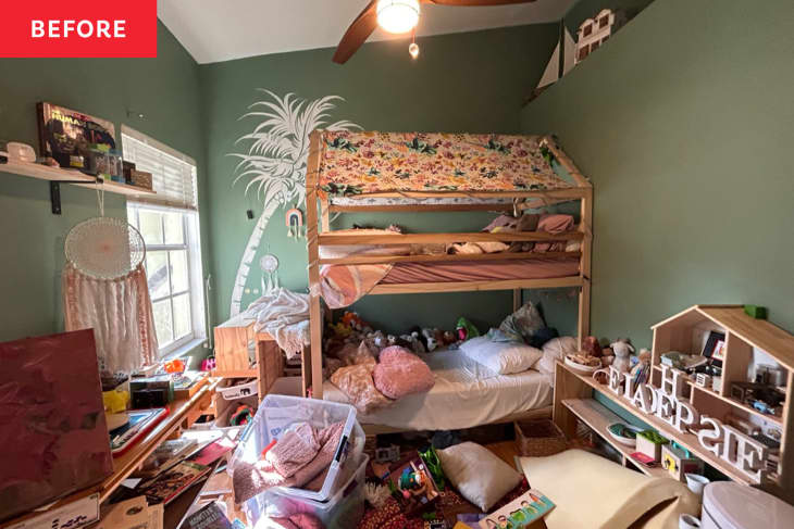 Sierra and Sam’s daughters’ room was stylish before, but it was lacking in function. As Sierra puts it (and as the cluttered photos would suggest), it had become “a dumping ground.” During the One Room Challenge, Sierra and Sam decided to add some built-in features to help tame the mess. A room redo became even more urgent after the couple discovered mold underneath the baseboards of their daughters’ bunk beds and in between the bedroom walls.