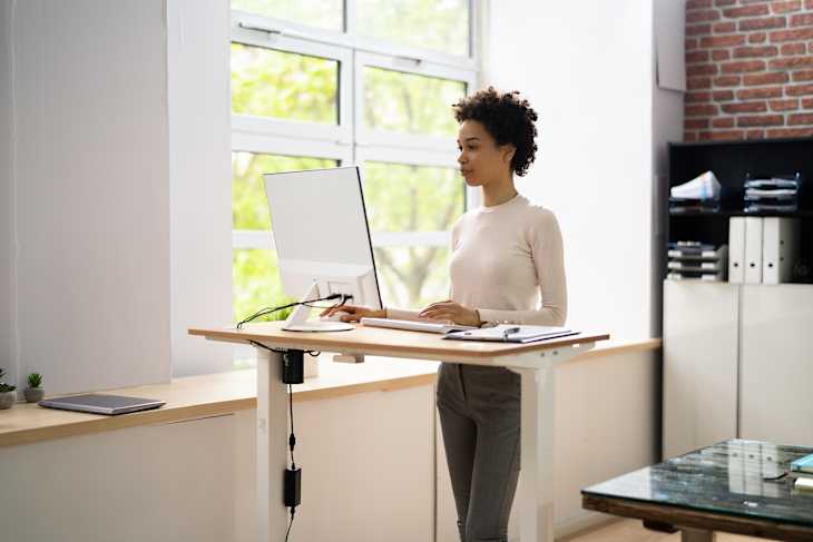 Woman Using Adjustable Height Standing Desk In Office For Good Posture