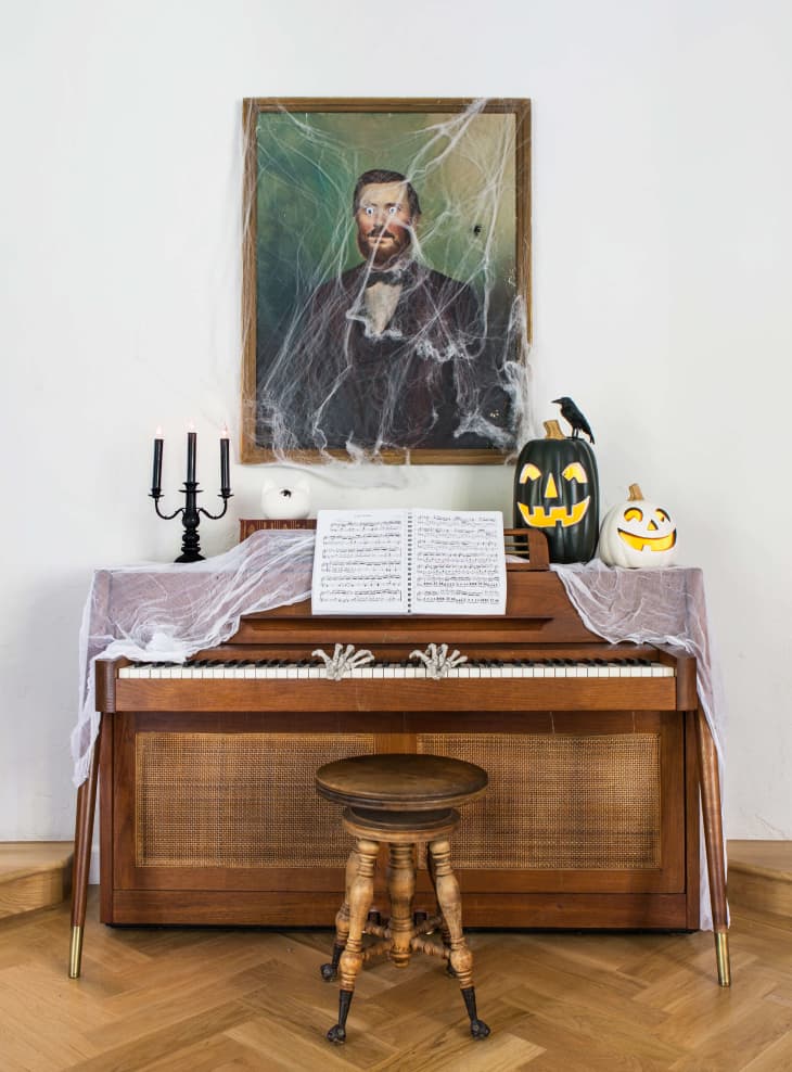 So Emily Henderson’s technically not an HGTV star anymore, but once a part of the family, always family right? And this girl definitely throws down for Halloween, so I had to include her. This year, she went with a spooky castle theme so nothing was too scary for her littles. And I have to say, it looks pretty good. I love that she worked with what she had and just made those things creepier—vintage portraits covered in cobwebs and sporting googley eyes, skeleton hands “playing” her piano and displaying her books pages-out so they create a light, neutral background that faux crows and black pumpkins will stand out against. If you just did one of these things, it would up the spook factor in your house without requiring too much time or money.