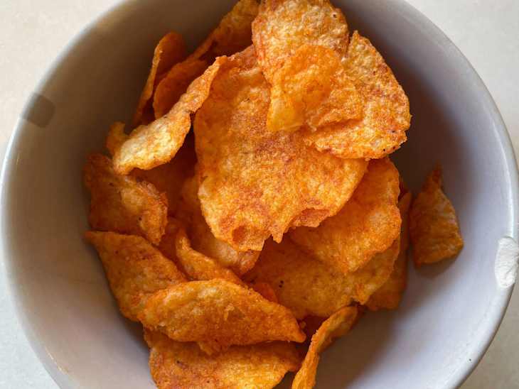 Hot sauces aren’t my condiment of choice (I’m a mild girl), but I come from a family that likes to put it on everything. So I know the flavor profile well and was curious to see how it fared on a chip. This is the only classic thin chip in the lineup and is orange-reddish in color. It honestly looks similar to a barbecue chip but without all the specks.